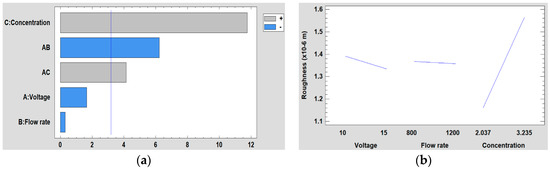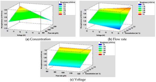 Regarding to the results obtained in the DoE analysis for the surface roughness, it can be seen in Figure 11 that the concentration is the most significant variable, followed by the interaction between voltage and flow rate and the interaction between voltage and concentration. However, it is shown that both the voltage and the flow rate do not have a significant influence, and also, they are the variables with less influence over the resultant surface roughness. This is also corroborated in Figure 11b where it is observed how the line that represents the influence of the concentration has a greater slope than the voltage and the flow rate, respectively. Likewise, it is appreciated that as concentration increases, the surface roughness is also increased.