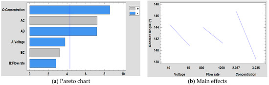 The study of the influence of concentration, voltage, and flow rate on the water contact angle can be observed in Figure 13. On the one hand, the Pareto chart (Figure 13a) shows that concentration is the most significant factor, followed by the interaction between voltage and concentration and the interaction between voltage and flow rate. On the other hand, in the graph of the main effects (Figure 13b), it is observed how the concentration has more influence on the water contact angle than the flow rate and the voltage. In addition, it is also shown that it has an inverse effect on the contact angle, because when the concentration is higher, the contact angle is smaller. The main reason of this increase in the wettability properties is associated to the hierarchical fiber/bead structure [67], making a multiscale surface morphology possible [68].