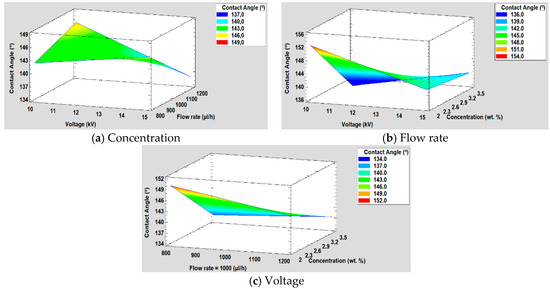 Contact Angle (°) = 201.064 + 0.0612654 × Voltage + 0.0459973 × Flow rate − 49.0714 × Concentration − 0.0069525 × Voltage × Flow rate + 2.33639 × Voltage × Concentration + 0.0129278 × Flow rate × Concentration