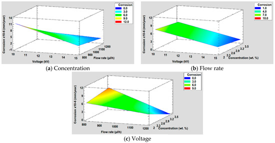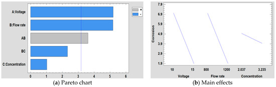 For the study of corrosion, when performing the DOE analysis, it is observed that in this case, the voltage and the flow rate are the most significant factors followed by the interaction between the voltage and the flow rate (see Figure 15). Likewise, in Figure 15a, it can be seen that both factors have practically the same influence on corrosion, whereas the concentration in this case is not a significant factor, showing a minimal influence. This conclusion is supported by the main effects graph (Figure 15b), where it is observed how the slope of the voltage and the flow rate are practically similar and it is also greater than concentration one. Likewise, it is observed that the variation of voltage and flow rate is inversely proportional to corrosion.