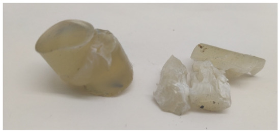 The compression test was conducted following ASTM D695-15 using a universal testing instrument (MTS model MH/20) with 100 kN load cell and with an overhead speed of 1.3 mm/min at room temperature. The compressive modulus, compressive strength, and elongation at break were reported. Cylindrical specimens of a length of 25.7 mm and diameter of 12.3 mm (Figure 2b) were compressed between the fixed (lower) and movable (upper) plates. The loading was continued until either the value of the load decreased by 10% of the maximum value or the specimen fracture occurred; otherwise, the experiment was interrupted manually when a specific contraction value was reached. Figure 4 shows the specimen after compression: the left image represents a buckled sample while the right one shows a fractured sample.