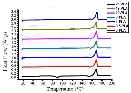 Generally, increasing the annealing time of PLA increases . The fast cooling sample exhibited = 53 °C whereas = 59 °C was observed in 24 PLA samples. The values of measured for neat PLA in this study were within the range reported in the literature [5,6]. In general, in PLA depends on D-lactate contents and the molecular weight. Accordingly, PLAs exhibit lower (up to 60 °C) compared to petroleum-based polyesters, with as high as 80 °C [14,25]. In addition, a cold crystallization exotherm was observed in the 0-PLA sample (Figure 5) at = 89.9 °C and = 19.2 J/g. The disappearance of the cold crystallization peak from annealed PLA samples (0.5-PLA–24-PLA) indicates that no more crystalline structures are generated during the heating cycle. There is a strong relationship between the annealing time and , as when the annealing time increases, the decreases. In addition, almost there is no exothermic peak that could be identified at PLAs’ samples that have ~ 40% [18,26].