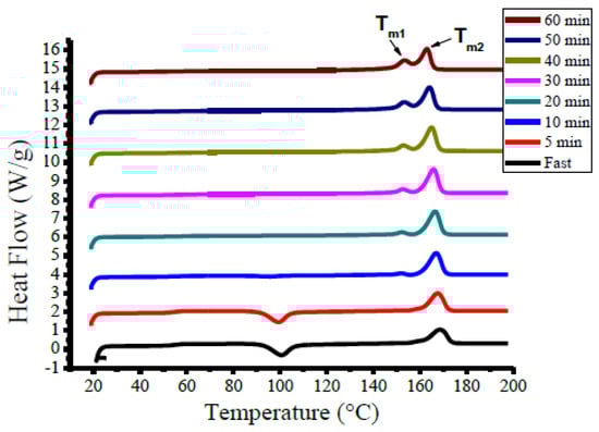 Case B involves the effects of fast cooling on the degree of crystallization () and the thermal properties of PLA before reaching the annealing temperature (95 °C). A cooling rate of 80 °C/min was applied to avoid any premature crystallinity before the annealing temperature (Figure 3b). The effect of annealing time (0, 5, 10, 20, 30, 40, 50 and 60 min) on the PLA’s thermal profile is shown in Figure 7 and the thermal parameters are enlisted in Table 3. The decreased slightly with the increasing annealing interval contradicting the behavior observed in Case A. In general, the observed was in the range of 49.1–55.1 °C [14,25]. Comparing with the annealing time, the fast cooling in Case B reduced . Unlike in Case A, Figure 7 shows three peaks of crystallization at 101, 99, and 94.3 °C for a 0, 5, and 10 min annealing time, respectively. The appearance of these peaks indicated that these samples still have the capacity to produce crystalline structures during the heating cycle of the DSC.