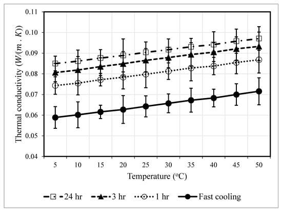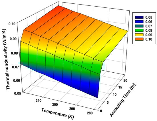 Figure 8 and Figure 9 show the effect of the annealing time on the thermal conductivity of processed PLA in the temperature range of 5–50 °C. A significant impact of the annealing process was observed on the thermal conductivity of PLA. For example, the thermal conductivity increased from 0.06426 for the fast cooled PLA to 0.09044 for the 24 h-annealed samples. Increasing annealing time interval increased the thermal conductivity. Increasing annealing time might have allowed spherulites to form comfortably and crystallites to grow in a more orderly fashion, which helped the fast heat transfer due to compact structure [22]. Additionally, the increasing degree of crystallization of PLA might have reduced gaps between the chains and air voids resulting in increased thermal conductivity.