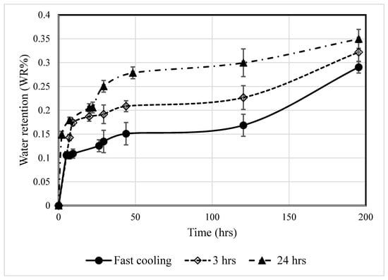 In the selection of thermal insulation materials, water retention is a pertinent physical property dictating the performance of thermal insulation materials. Figure 10 presents the effect of annealing time on the water retention (WR%) of processed PLA as a function of immersion time (hours). The WR% increased with increasing time without reaching an equilibrium value within 8 days of the immersion period. Furthermore, the calculated from Equation (1) increased with the annealing time (24 h > 3 h > fast cooling).
