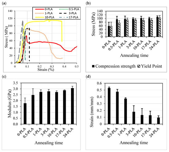 The mechanical performance of semi-crystalline polymers depends on multiple factors including the degree of crystallinity. The stress–strain behavior of processed PLA is shown in Figure 11a. The effect of the annealing process on the compression properties of PLA is presented in Figure 11a–d.