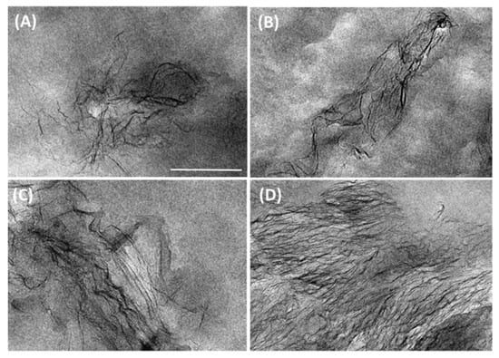 In order to further investigate the nanocomposites morphology, TEM images of all materials were obtained. As shown in Figure 2, graphene sheets appear to be partially exfoliated with some wrinkled or folded laminates, but generally well dispersed within the polymer matrix in all nanocomposites. Only in the nanocomposite processed by extrusion with the highest filler content were larger aggregates observed with some degree of orientation (Figure 2D).