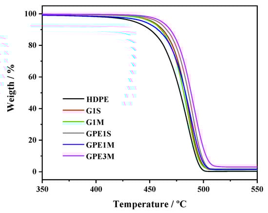 An enhancement in thermal stability with the incorporation of graphene has been previously found for polyolefin nanocomposites [,] and, in particular, for HDPE nanocomposites [,]. It can be noted that the increase observed in Ti for GPE3M is one of the highest observed when compared to those described in the literature for HDPE/graphene nanocomposites.