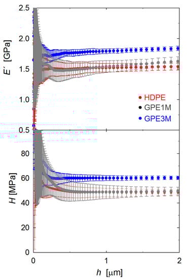 The mechanical performance of the nanocomposites was investigated by indentation testing. Figure 4 illustrates, as an example, the storage modulus, E′, and hardness, H, behavior as a function of indenter displacement into the surface of HDPE and two of the nanocomposites. A large data scatter is found at small h values below ≈500 nm most probably due to surface roughness. This effect is minimized as the indenter progresses towards the bulk and one can see fairly constant E′ and H values beyond h ≈ 500 nm. Such behavior indicates that no significant micrometer-scale inhomogeneities associated to changes in the matrix structure or in the filler distribution appear across the sample thickness. Moreover, the error bars in Figure 4 represent the standard deviation of the mechanical data retrieved at different locations along the surface (≈40 indentations). It can be seen that values of the standard deviation are quite small at large indentation depths: for each h value, the standard deviation is around 2–6% of the mean E′ and H values. It is also noteworthy that the incorporation of graphene has no influence on the data dispersion. Hence, the results suggest that the dispersion of the filler is also homogeneous at a micrometer scale along the surface. To make this point consistent with the dispersion of graphene platelets shown in the SEM micrographs of Figure 1, one should recall that the volume of deformation is not limited to the region immediately next to the indenter-sample contact but encompasses a large volume that typically extends up to ≈10 times the indentation depth for the plastic field and in the range of ≈20 times the indenter displacement for the elastic limit [,].