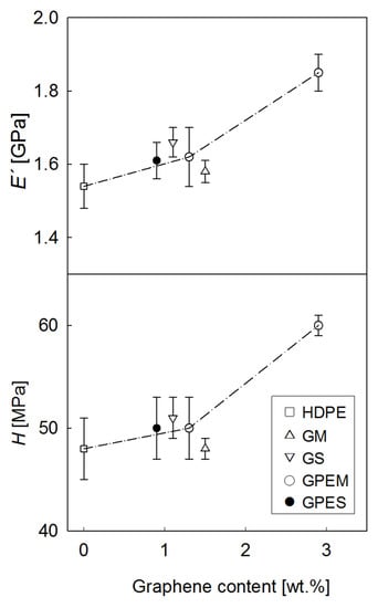 Storage modulus, E′ and hardness, H, as a function of graphene content (neat graphene, i.e., excluding the polymer brushes) for all the nanocomposites and the starting HDPE: GM, neat graphene and melt extruded; GS, neat graphene and solution mixed; GPEM, modified graphene and melt extruded; GPES, modified graphene and solution mixed. The dashed lines are guides for the eyes.