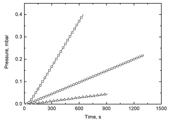 The curves showing the evolution of the gas transport as a function of time exhibit a transient zone at short time followed by a region at long times in which the pressure is a linear function of time. An illustrative plot of the variation of the pressure p(t) of oxygen, nitrogen, and carbon dioxide in the downstream chamber as a function of time in the GPE1M membrane is represented in Figure 6.