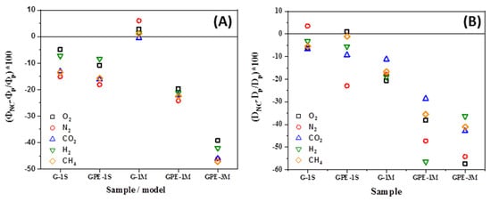 As can be seen in Table 3 and Table 4, there are significant differences in all parameters depending on the type of membranes as well as on the experimental procedure employed to prepare them. Figure 7 represents the variation of the permeability (Figure 7A) and diffusion coefficients (Figure 7B) of the nanocomposites membrane with respect to the HDPE membrane. From Figure 7, it is possible to assure that the nanocomposites with functionalized graphene (GPE) present better barrier properties than those with non-functionalized graphene. In addition, in the GPEM series the higher the loading of GPE the higher the barrier effect; a permeability reduction between 40–50% for all evaluated gasses was measured for GPE3M. The differences observed between the two families of nanocomposites cannot be attributed to variations in crystallinity between the samples, which are very similar (see Table 1) but to an enhancement in the dispersion and filler/matrix interactions in the GPE series. In addition, the filler aspect ratio and its orientation within the polymer matrix relative to the diffusion direction are other factors that must be considered.