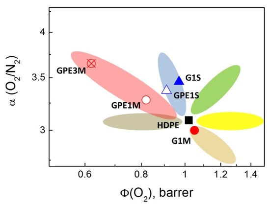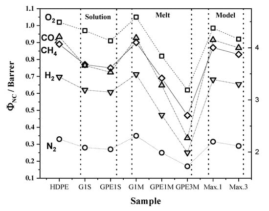 The experimental results shown in Table 3 and Table 4 for all nanocomposites described in this work are also represented in Figure 8. As can be seen, the membranes prepared from solution, independently of the nature of filler used (G1S and GPE1S) show a characteristic behavior of the formation of a rigidified polymer layer around the filler. However, the nanocomposites membranes prepared with GPE by melt-blending seem to present a typical morphology in which the gas passes through the polymer/functionalized graphene interface with reduced permeability. This fact could be explained assuming that this interface is stronger as a consequence of the better compatibility between both phases. On the contrary, the membrane prepared with non-functionalized graphene (G1M) seem to present a typical case III morphology in which the slightly lower compatibility between non-functionalized filler and HDPE would provoke some voids in the interphase region through which gas molecules can diffuse.