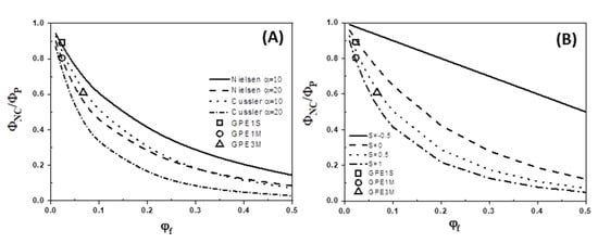 As an example, Figure 12A shows the effect of the aspect ratio (α) on the permeability decrease as a function of the filler volume fraction for Nielsen and Cussler models. The experimental values for nanocomposites prepared with GPE filler are also represented in Figure 12. It is clear that for both models, the barrier performance improves as the value of α increases. Furthermore, our experimental data showed good agreements with the Nielsen model with an aspect ratio α = 10–20 and with the Cussler model with α = 10.