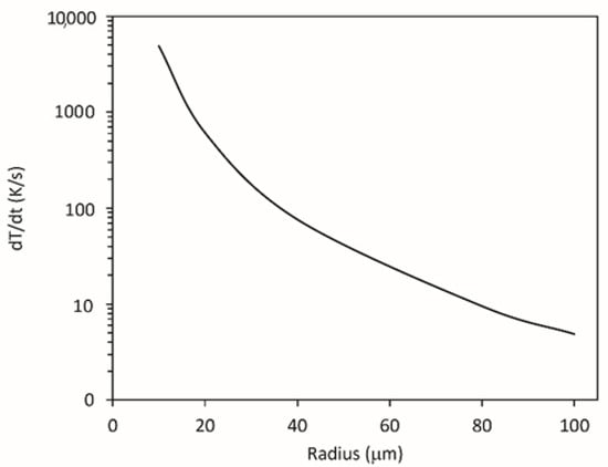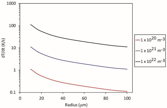 where rsheath and r are the radii of sheath and the polymer particle, respectively. The sheath thickness assumed in Equation (9) is equal to λD. In practice, the sheath thickness is larger; therefore, Equation (9) represents the lower value of the heating rate. Figure 2 represents the heating rate of polyethylene powder levitating in non-equilibrium oxygen plasma with the neutral gas kinetic temperature of 300 K and the electron temperature of 3 eV versus the radius of the powder particles. The heating rate does not depend on the density of ions (ni), because the Debye length is inverse proportional to the square root of the ion density, as in Equation (5). The heating of powder particles levitating in plasma by ions is by far more important than heating by neutral reactive particles such as atoms, especially for small powder particles. Here, it should be stressed that Equation (9) is just a rough, but a useful approximation.