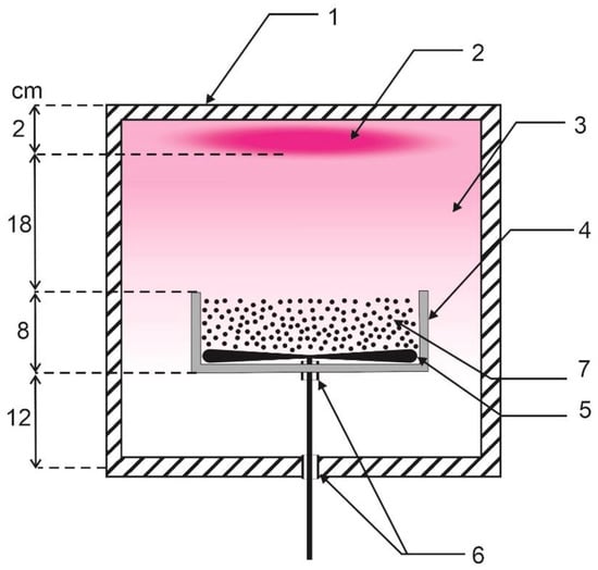 Schematic of the plasma reactor: (1) cubicle reactor with dimensions 40 × 40 × 40 cm3; (2) dense plasma; (3) diffusing plasma; (4) fixed stainless–steel dish; (5) rotatable stirring device; (6) rotatable troughs; and (7) polymer powder.