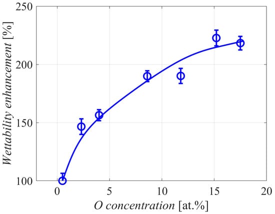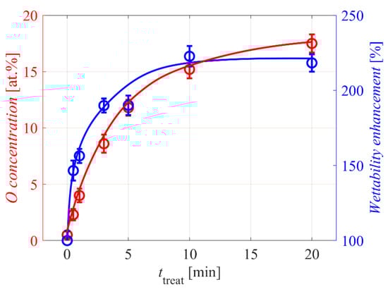 Oxygen concentration and increased wettability versus plasma treatment time.