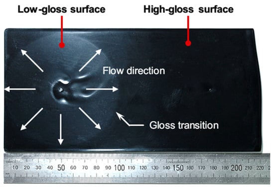 The surface defects mainly depend on the molding condition in the filling stage. Yoshii [20,21] and Tredoux [22,23] proposed that wavelike flow marks are induced by the go-over phenomena and nonuniform thermal contraction under a low injection speed in the filling stage. Yokoi [24] and other researchers [25,26] proposed that the tiger stripes observed in the alternating gloss-dull stripes are generated at high injection speeds, and they are attributed to the flow instability related to the Weissenberg number in the filling stage. For the gloss transition defect generated in the middle range of injection speeds, Isayev and Kim pointed out that stable surface gloss can be achieved by constantly maintained melt flow [27]. Jeon et al. [28], Yuan et al. [12], and Bott [29] proposed that the hesitation of the flow causes the gloss defect and referred to it as flow hesitation or the halo mark. Suhartono et al. [13] showed that the stress distribution of the numerical simulation result near the hot gates resembles the gloss transition and referred to it as a stress mark. Yuan et al. [30] observed that the sudden fluctuation of the melt pressure causes the gloss transition defect, and referred to it as a pressure transition mark. Prior studies on the gloss transition defect proposed that enhanced mold surface replication increases the surface gloss. However, existing studies have not investigated the generation of a low-gloss polymer surface in a highly polished mold, as shown in Figure 1, and the influence of the filling condition on the surface gloss.