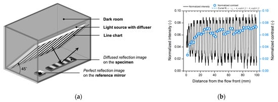 The intensity profile analysis (IPA) developed by the Polymer Competence Center Leoben (PCCL) was employed to measure the gloss distribution on the short-shot specimen [35,36]. The measurement of the gloss distribution using the standard glossmeter requires repetitive measurements at different surface positions due to the small measuring area. The IPA based on the evaluation of the modulation transfer function can measure the gloss distribution close to human vision using a single measurement with high precision [35,36]. According to the visual test method of gloss difference [37], the contrast of the reflected image reveals the quality of the surface reflection and gloss. Figure 4a shows the measurement setup. The measurement was conducted in a dark room to prevent the influence of external lights. The line chart was illuminated by the diffused light source on the rear side. The high-contrast image of the line chart was projected onto the specimen surface and reference mirror. The reflected images on the specimen and mirror were both captured using the digital single-lens reflex camera EOS 700D with the EF-S 18–55 mm lens of Canon Inc. (Tokyo, Japan).The aperture was closed to F/9 to ensure a deep focal depth. The reflected image of the reference mirror was employed to focus on the line chart and normalize the intensity of the captured image. The positional contrast was derived from the intensity profile, as shown in Figure 4b.