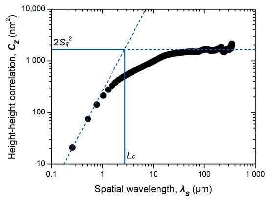 The topography parameters, RMS roughness (Sq), and lateral correlation length (Lc) were determined by the height–height correlation function (HHCF, Cz) of the measured surface, as shown in Figure 5. HHCF is defined as follows [39]: