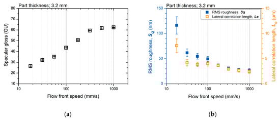 The surface gloss and topography parameters show a similar tendency to the flow front speed. Figure 6a,b shows the measured surface gloss and the topography parameters of the specimen molded at various flow-front speeds, respectively. The surface gloss increased as the flow front speed increased. The RMS roughness and lateral correlation length decreased as the flow front speed increased. The surface gloss and topography parameters converged at a high flow-front speed. This similar trend for different molding conditions indicates a strong correlation between the surface topography and gloss.