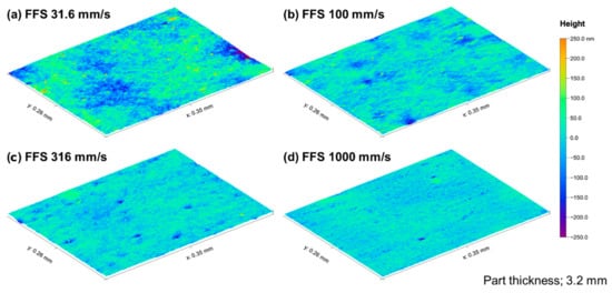 Surface topography molded by various flow-front speeds (FFS); (a) 31.6 mm/s, (b) 100 mm/s, (c) 316 mm/s, and (d) 1000 mm/s.