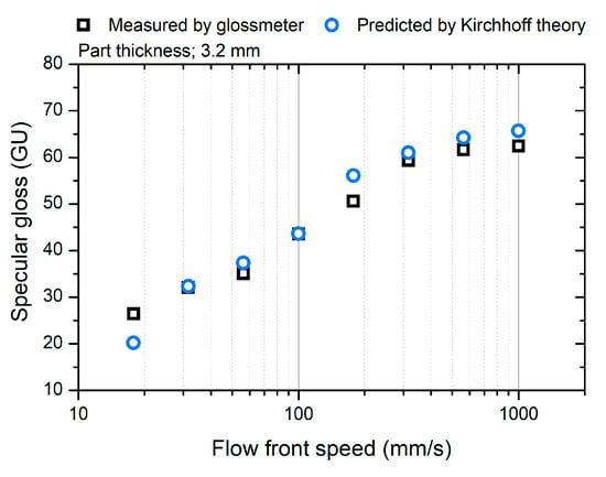 The theory of light-scattering phenomena can explain the relationship between surface topography and gloss. This is because the gloss depends on the degree of the reflected light concentration at the specular angle. As shown in Figure 7, the relatively low-gloss surface molded by a low flow-front speed shows a rough topography. This rough surface scatters the reflected light over a broad angular range. The rough surface induces diffused reflection and appears less glossy. The surface gloss can be modeled by the Kirchhoff theory of light scattering according to the surface roughness [41]. According to the modified Kirchhoff theory suggested by Alexander-Katz and Barrera [42], the surface gloss can be modeled as a function of the RMS roughness and lateral correlation length.