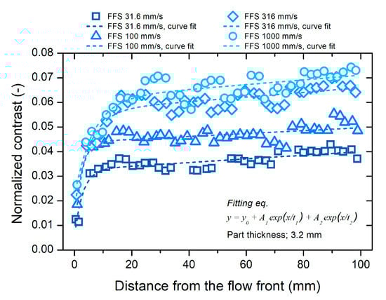 The gloss distribution of the short-shot specimen was analyzed to investigate the change in the polymer surface during the molding process. Figure 9 shows the distributions of the surface gloss on the short-shot specimen along the distance from the flow front. The contrast in Figure 9 indicates the surface gloss. As the distance from the flow front increased, the surface gloss increased. In particular, the gloss increased rapidly at a distance less than 20 mm, and gradually at a distance greater than 20 mm. A higher flow-front speed resulted in a more rapid increase in the surface gloss near the flow front. A similar distribution was observed in all the specimens molded in a wide range of flow front speeds. The distribution of the surface gloss could be explained by two factors: the generation of the rough surface due to surface shrinkage and the mold surface replication due to the melt pressure.