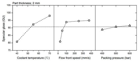 The flow front speed in the filling stage is a significant parameter on the surface gloss as much as the mold temperature. The mold temperature has the largest influence on the surface gloss as Figure 13 and as reported by prior research [1,2,3,4,5,6,7,8,9,10,11]. In comparison with the mold temperature inducing a gradual increase of the surface gloss, the flow front speed increased rapidly the surface gloss below 100 mm/s of the flow front speeds, as shown in Figure 13.