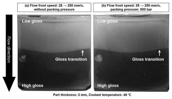 Effect of the packing pressure on the gloss transition defect caused by the flow fluctuation 25–250 mm/s; (a) without packing pressure, and (b) with 500 bar of packing pressure.