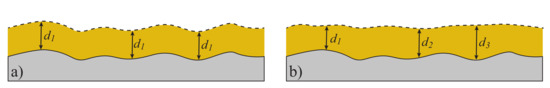 Polymer thin film (yellow) on a silicon substrate (grey) with: (a) correlated roughness and therefore a homogeneous layer thickness () and (b) uncorrelated roughness and different layer thicknesses at three positions (.