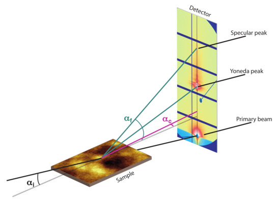 While non-conformal films can be described with an average layer thickness, conformal films show a locally defined layer thickness. If two interfaces are correlated, scattered X-rays of both interfaces undergo constructive interference and additional oscillations (intensity maxima) appear. These signals can theoretically be characterized with XRR, but the intensity is in phase with the oscillations of the reflectivity curve [9,10,11]. Therefore, a simple modeling of XRR curves using a Parratt formalism will lead to erroneous results, especially by modeling interfacial roughnesses, which are systematically too low. In addition to XRR experiments another technique, like Grazing Incidence Small Angle X-ray Scattering (GISAXS) is required, to verify if two interfaces are correlated [8,12,13]. GISAXS is a powerful tool for structural characterization of soft-matter thin films. In GISAXS experiments a 2D detector allows the study of off-specular and non-specular scattering in reciprocal space, so that lateral structures (y-direction) of thin films and structures perpendicular to the substrate surface (z-direction) can be explored in respect to the X-ray beam (x-direction). Coordinates in y- and z-direction in real space correspond to wave vector coordinates and in reciprocal space. Unlike specular XRR measurements, where the incident angle changes during the measurement, GISAXS commonly may be carried out at a constant incident angle, which is close to the critical angle of the material, to balance a defined penetration of X-rays into the sample and get optimal scattering intensity [12,13]. A schematic illustration of a GISAXS setup is shown in Figure 2.