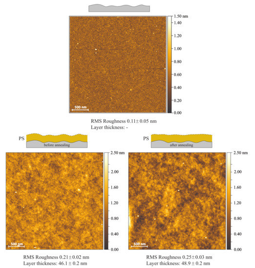 Figure 5 shows that in comparison to a bare substrate, the RMS roughness of spin-coated films with and without annealing is not significantly increased, only 0.21 nm and 0.25 nm, compared to 0.11 nm for the bare substrate. The ellipsometric layer thicknesses of both films (46.1 nm and 48.9 nm) differs by 2.8 nm, which is a deviation from the spin-coating process and cannot be related to the annealing. Comparing the topography images obtained from AFM measurements of PS spin-coated films with and without annealing, very small changes can be observed, as the lateral size and depth of deeper areas increases with annealing.