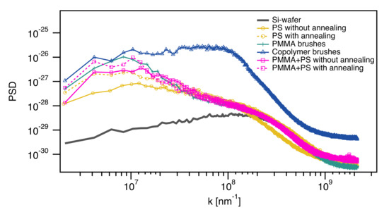Radially averaged power spectral density of polymer thin films in comparison. PSDs were calculated from AFM topography measurements.