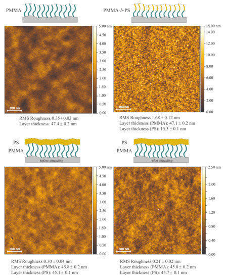 The phenomenon of roughness correlation has been shown for liquid films on surfaces, spin-coated thin films and polymer blends. For polymer brushes it has been hinted at. In their studies on spin-coated PS films, Müller-Buschbaum et al. observed a correlated film after spin-coating, which lost all correlations after heating above the glass transition temperature [16,17,18]. During this annealing, temperature increases the mobility of the polymer and the film relaxes from a nonequilibrium state after spin-coating, to an equilibrium stable state. In contrast to spin-coated films, the roughness correlation present in polymer brushes is stable to annealing at high temperatures, which was shown by unpublished results from Ochsmann and Akgun et al. [29,34]. However, a detailed analysis and comparison between both polymer systems has not been published yet. Therefore we concentrate on the similarities and differences in topography, surface roughness and roughness correlation between spin-coated films and polymer brushes and their behavior with respect to annealing. Various samples were prepared, which are shown in Figure 4. As PMMA and PS are standard polymers, which have also been extensively studied in brush systems, both were chosen as materials for these experiments. Next to spin-coated PS films and PMMA- and PMMA-b-PS brushes, PS was also spin-coated on top of PMMA brushes, to investigate the roughness correlation of polymer multilayers and prove the persistence of correlated roughness in polymer brushes.
