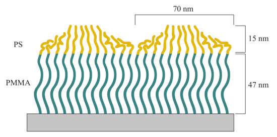 Schematic sketch of PMMA-b-PS diblock copolymer brushes in dry state. PS chains accumulate on top of PMMA brushes, to minimize their contact with PMMA and air. This shape is inferred by the layer thickness of 15 nm of the PS block and the PS domain diameter of 69.8 nm.
