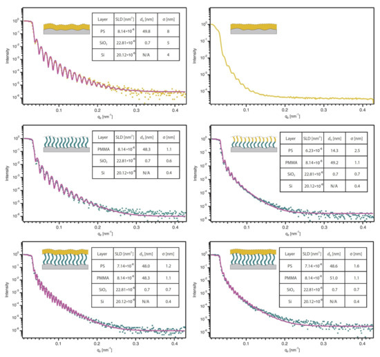 The following are available at https://www.mdpi.com/xxx/s1", Figure S1: Detector image and qz line cut of PS brushes, to prove roughness correlation, Figure S2: Determination of the lateral cutoff length c of PMMA brushes (left) and PS brushes (right) via qz line cuts as a function of qy. All curves are shifted for better visibility and represent the mean value of scattering intensities of four pixels with additional smoothing afterwards. Modulations origin from roughness correlation disappear at qy = 0.051 for PMMA and qy = 0.065 for PS, Figure S3: Determination of the lateral cutoff length c of PMMA-b-PS diblock copolymer brushes (left) and PMMA brushes with a spin-coated PS film on top (right) via qz line cuts as a function of qy. All curves are shifted for better visibility and represent the mean value of scattering intensities of four pixels with additional smoothing afterwards. Modulations origin from roughness correlation disappear at qy = 0.106 for copolymer brushes and qy = 0.030 for the PMMA-PS multilayer system.