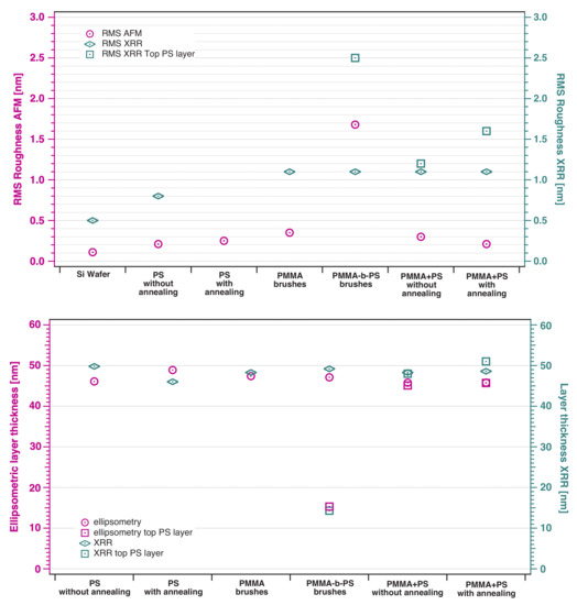 Comparison of layer thickness and RMS roughness results of all samples, which where performed with AFM, ellipsometry and XRR measurements. Top diagram: RMS roughness of a silicon substrate and polymer thin films, measured with AFM and XRR. XRR results are significantly higher than AFM results, which is a hint for roughness correlation. Bottom diagram: Layer thicknesses of polymer thin films, measured with ellipsometry and XRR. Results of both methods are in good agreement.
