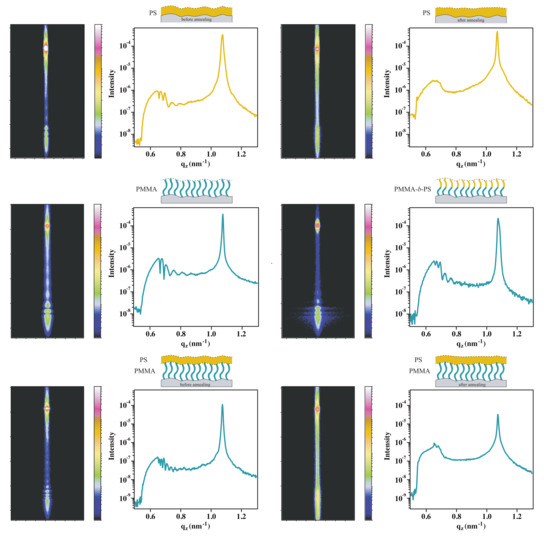 Although the block-copolymer brush system shows small domains of collapsed PS chains on top of PMMA blocks, conformality between the surface of the PS domains and the silicon substrate is observed as the width of oscillations in the detector cut matches the thickness of PMMA-b-PS brush layer (Figure 13). As an additional proof, that the oscillations are caused by roughness correlation of spin-coated films and brushes, PS films on PMMA brushes are analyzed before and after annealing. Before annealing two different modulations are visible in -line cut, namely the scattering from the PMMA brushes and PS film (Figure 11). This is in an agreement with our assumption from AFM and XRR results that no diffusion of PS into the brush layer takes place. This assumption is also supported by the Flory-Huggins interaction parameter of PMMA and PS [36,37]. From literature an interaction parameter of