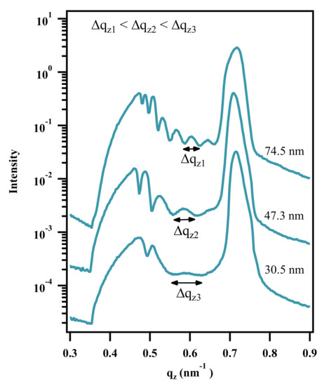 All detector scans in Figure 12 indicate roughness correlation. The oscillation widths shrink from the 74.8 nm brush layer over 47.3 nm to 30.5 nm and show the expected inversely proportional relation of layer thickness and distance between two minima in the line profiles ().