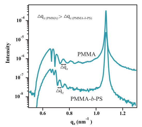GISAXS line cuts in -direction of PMMA brushes and PMMA-b-PS diblock copolymer brushes. The distance between two oscillation minima in the PMMA brushes () is higher than in copolymer brushes, which is an indicator for a lower layer thickness of PMMA brushes.