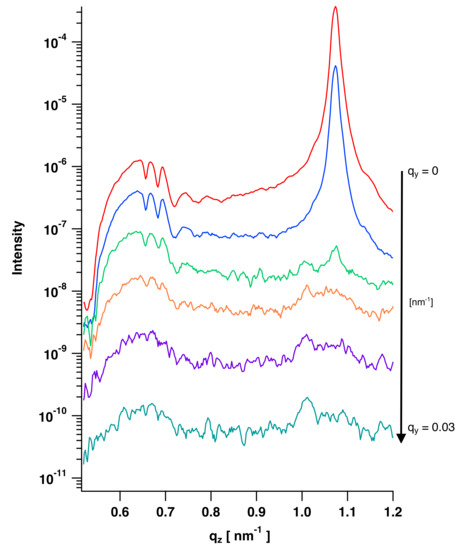 where is the first in-plane wave vector at which all modulations are vanished [15,18]. The pixel position of the beam center is defined as value of 0. For a better signal noise ratio, 4 pixels in -direction are summed up to one line cut. Furthermore, every line cut was smoothed by calculating the median of three values to one value. This procedure gives a clear view on the oscillations. As modulations disappear after annealing, could only be determined for samples without annealing procedure. The position, where the beam center of the direct beam hits the 2D detector is defined as a wave vector of = 0 nm. Line cuts along will therefore be taken at higher pixel values. For example, at a wave vector of 0.03 nm modulations of the spin-coated PS film disappear, which corresponds to a lateral cutoff length of 207 nm (Figure 14).