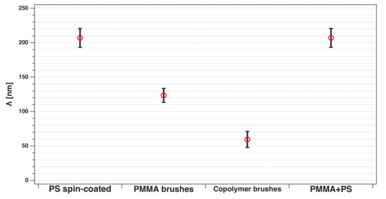 For PMMA brushes, the smallest lateral structure length, which is replicated to the polymer surface is around 123 nm. Compared to the spin-coated films, polymer brushes seem to copy smaller length scales of the roughness profile. PMMA-b-PS brushes have the lowest lateral cutoff of 60 nm. This is in good agreement with the size of the PS aggregates of 69.8 ± 2.8 nm, indicating that the flat tops of PS dimples (see Figure 8) are also correlated with the conformal PMMA brush surface. From the silicon surface to the top PS layer, especially the larger length scale waviness information get lost.