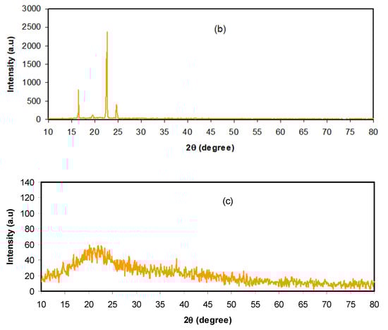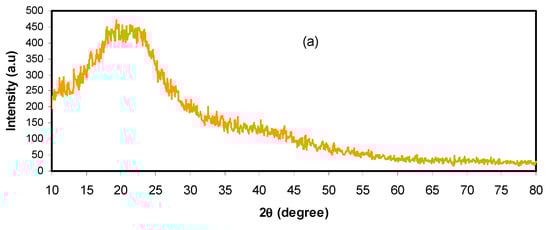 XRD examination was performed for pure CS:DX and plasticized electrolytes at room temperature, as depicted in Figure 1. In earlier works, it was found that pure CS has shown various crystalline peaks at 2θ = 15.1°, 17.7°, and 20.9° [29,30], while DX has shown two hallows at 2θ = 18° and 23° [29,31]. Herein, the XRD of CS: DX has two hallows at low and high 2θ degrees, and no crystalline peaks are detected, as shown in Figure 1a. These wide hallows indicate a fully amorphous structure [32,33]. Previous studies reported that the broad peaks correspond to the amorphous structure of the electrolyte system [34,35,36]. In this research, it was determined that the hallow intensity of CS:DX:NH4PF6 roughly vanished with the insertion of 14 wt.% of glycerol, as illustrated in Figure 1b. The NH4PF6 salt is a very low lattice energy salt. The cations and anions of salts with very low lattice energies can be easily associated, and their protrusion to the sample surface produces these sharp peaks [37]. In our previous works, such crystalline peaks were not observed for NH4SCN, NH4I, and NH4F salts within the polymer blends [38,39,40]. The broad nature, which is evidence of the amorphous phase, was found to appear again at 42 wt.% of glycerol, as shown in Figure 1c. It is noteworthy that, at 42 wt.% of the incorporated plasticizer, these crystalline peaks vanished and the hallow intensity decreased compared to the pure CS: DX spectrum. According to the literature, the ionic transport in polymer electrolytes occurs principally in the amorphous phases, which is directed by the segmental motion of the polymer chains [41]. The results of the present work establish that plasticization is one of the most adopted approaches used to suppress the crystallinity of polymer electrolytes. The glycerol plasticizer can dissociate more salts and disrupt the hydrogen bonding between polymer chains [41]. Thus, this improves the overall amorphous phase of the prepared samples, which acts as a pathway for ion conduction [41]. Additionally, more free ion will be available for conduction. These data results validate the electrolytes’ amorphous structure. The amorphous structure offers larger ionic diffusivity, leading to a higher DC conductivity. Impedance study in later sections may give more information. No peaks of NH4PF6 salt were emerged in the CS: DX electrolyte system, which shows the entire salt dissociation in the electrolyte system.