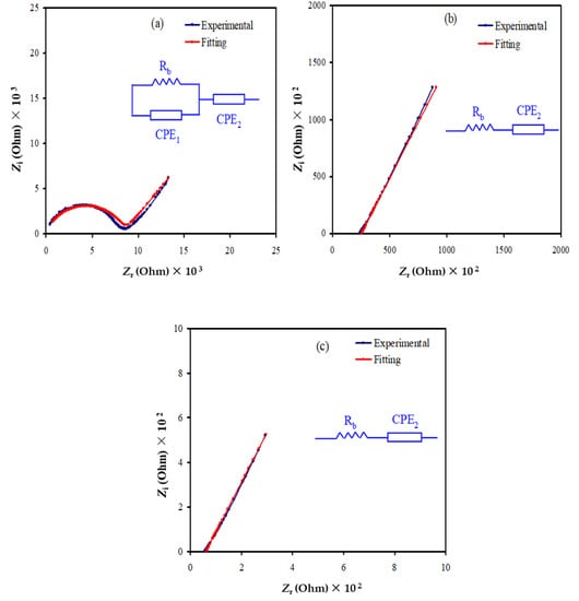 The EEC model is normally engaged in impedance spectroscopy inspection, as the EEC model is swift, simple, and creates an entire picture of the systems [46,47]. The EIS plots are expressed in terms of the EEC containing Rb for the carrier species in the films, as well as two constant-phase elements (CPEs), which are CPE1 and CPE2, as interpreted in the inset of Figure 3a–c. The CPEs are non-ideal capacitors. The region of high frequencies displays the connection of Rb and CPE1 (capacitor 1) in parallel, whereas the region of low frequencies (slanted line, a non-ideal capacitor, CPE2 in series) displays the created double layer capacitance among the SPE and electrodes. The CPE is generally employed in EEC rather than an ideal capacitor in real systems. The impedance of CPE (ZCPE) is expressed as [48]: