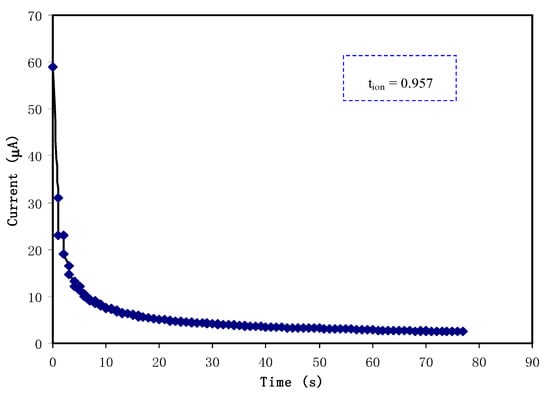 Typically, in polymer electrolytes the conductivity is due to the contribution of both electrons and ions. For EDLC applications, tion must be larger than telec; thus, TNM analysis has been performed at an operating voltage of 0.2 V. Ions are blocked at the stainless steel (SS) electrode surface. The polarization of SS | highest conducting sample | SS is shown in Figure 4. A large value of current can be seen at the beginning of the polarization, which is 58.9 μA. At this point, both ions and electrons are conducted. At 5 s, the current drops to 10 μA. At this stage, some of the ions from the electrolyte are blocked at the surface of the SS electrodes and form a charge double layer. Beyond 40 s, the stabilization of current value can be seen, where it becomes constant at 2.4 μA. The cell is completely polarized at this point, and only electrons can pass through the SS electrode. This pattern of the current value is normal for ionic conductors [50]. tion can be obtained via the following equation: