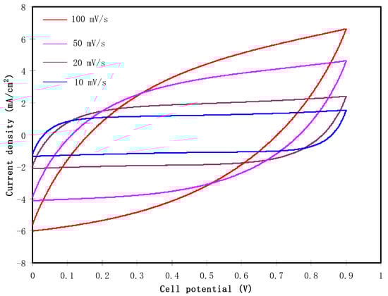 The fabricated EDLC must undergo CV analysis before the charge-discharge process. CV analysis is used to check the existence of capacitive behavior in the electrolyte, as well as finding the specific capacitance of the EDLC. Figure 6 shows the CV plot of the fabricated EDLC at scan rates of 100, 50, 20, and 10 mV/s. It is observed that for each scan rate, the CV profiles show no redox peak. The redox peak indicates deintercalation/intercalation or Faradaic processes that are entirely dissimilar to the mechanism of energy storage in the EDLC. The EDLC will accumulate energy within adsorption and desorption or non-Faradaic processes [52,53,54]. The pattern of the CV has a leaf-like shape at 100 mV/s. The shape turns to a more rectangular shape as the scan rate decreases to 10 mV/s. One of the features of a capacitor is that the response of CV is dependent on the scan rates. The conduction of ion happens at a fast rate at a high scan rate. Furthermore, due to the internal resistance and carbon porosity, the current dependence on voltage is produced [55]. The specific capacitance (Ccv) is expressed as:
