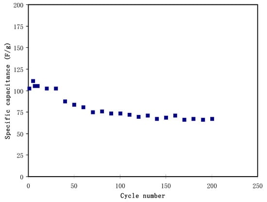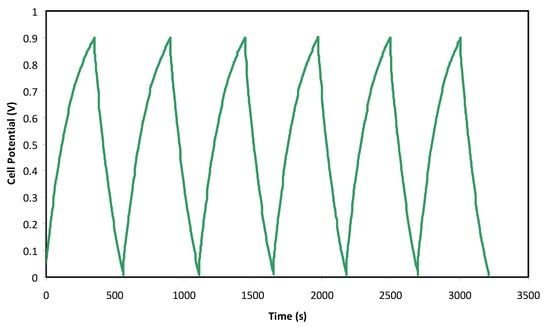 Figure 7 illustrates the common charge-discharge profile of the EDLC at selected cycles. The EDLC is applied to a current density of 0.5 mA/cm2 from 0 to 0.9 V for 200 cycles. Perfect linearity behavior cannot be observed at the slope of the charge and discharge part. This may be related to the occurrence of some electrochemical reactions at the electrode/electrolyte interface and thus give rise to the potential drop and effect on the charge-discharge profile. A very small reaction at the interface of the electrode and electrolyte may result in a small pseudo capacitance, which might also affect the linearity behavior of the charge-discharge pattern. A nearly linear discharge slope indicates that the EDLC has a suitable capacitor energy storage process [59]. A normal EDLC usually has a slight drop in potential value before the charge and discharge processes. This is because of numerous causes, including the gap between the electrolytes and current collectors, as well as the electrolyte bulk resistance. Specific capacitance (Cspe) can be obtained from the discharge part in Figure 6 via Equation (9):