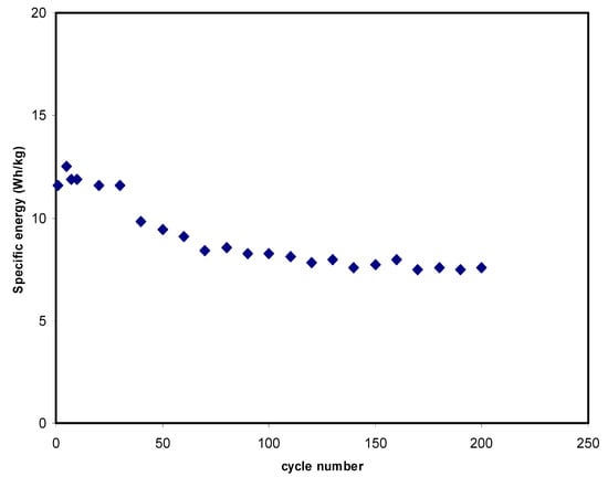 Specific energy of the EDLC at 0.5 mA/cm2 for 200 complete cycles.