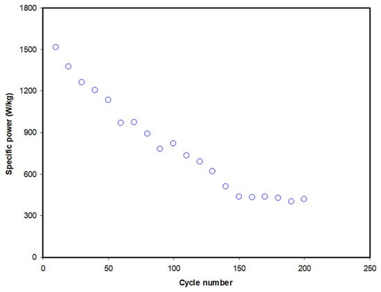 Specific power of the EDLC at 0.5 mA/cm2 for 200 complete cycles.